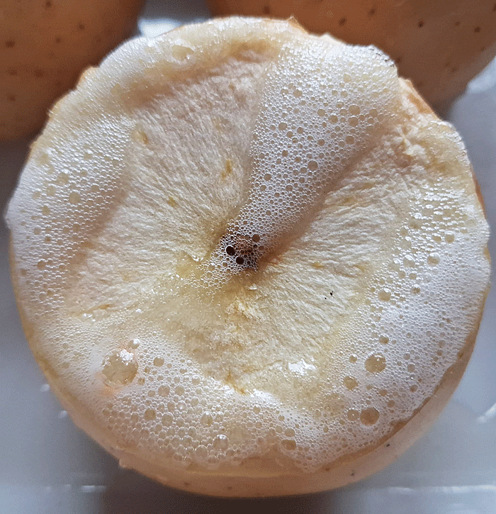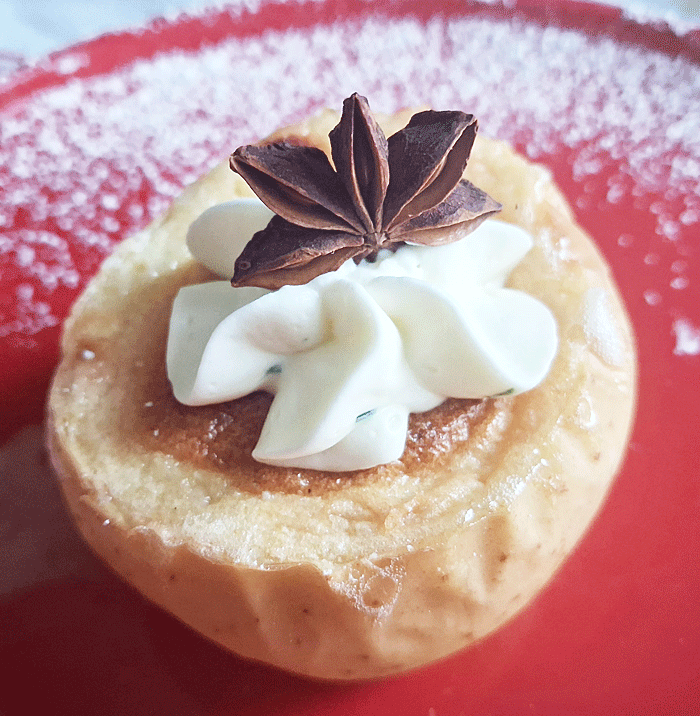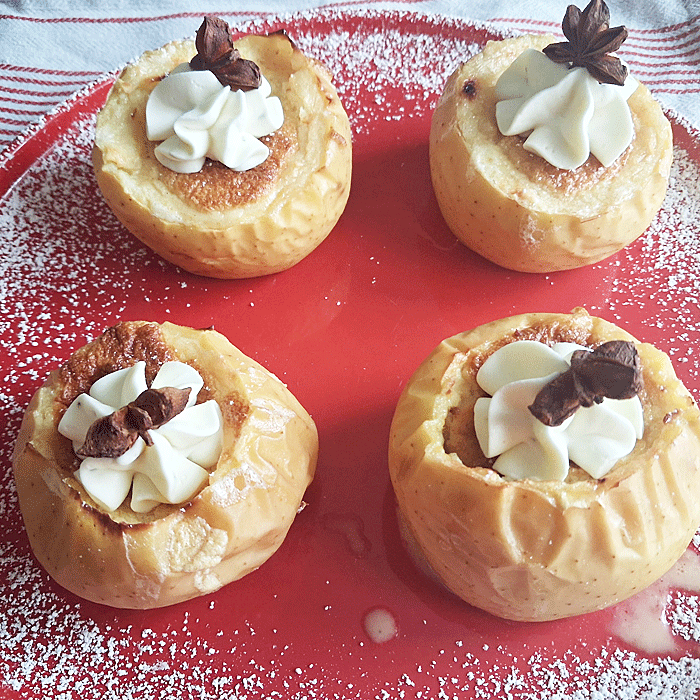 Enfournez pour 8 mn. Sortir les pommes du four, rangez-les sur un plat ou dans des assiettes individuelles, et servez aussitôt.