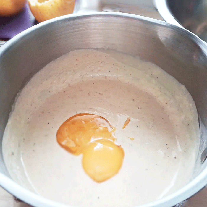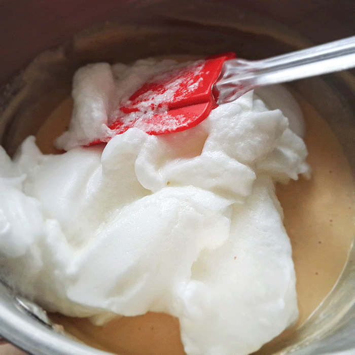 3. Cassez les œufs en séparant les blancs des jaunes. Montez les blancs en neige ferme avec une pincée de sel. Incorporez les jaunes à la crème au foie gras refroidie, puis, délicatement, les blancs en neige.