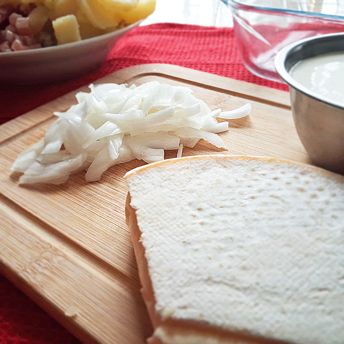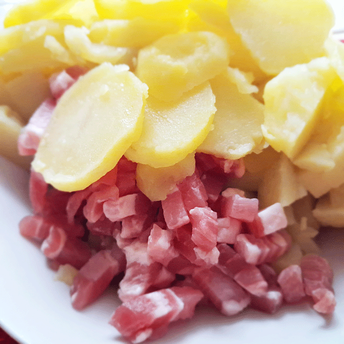 • 1 kg de pommes de terre cuites à l’eau avec leur peau et coupées en petits morceaux