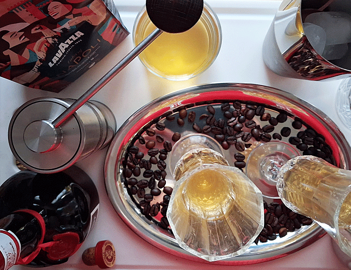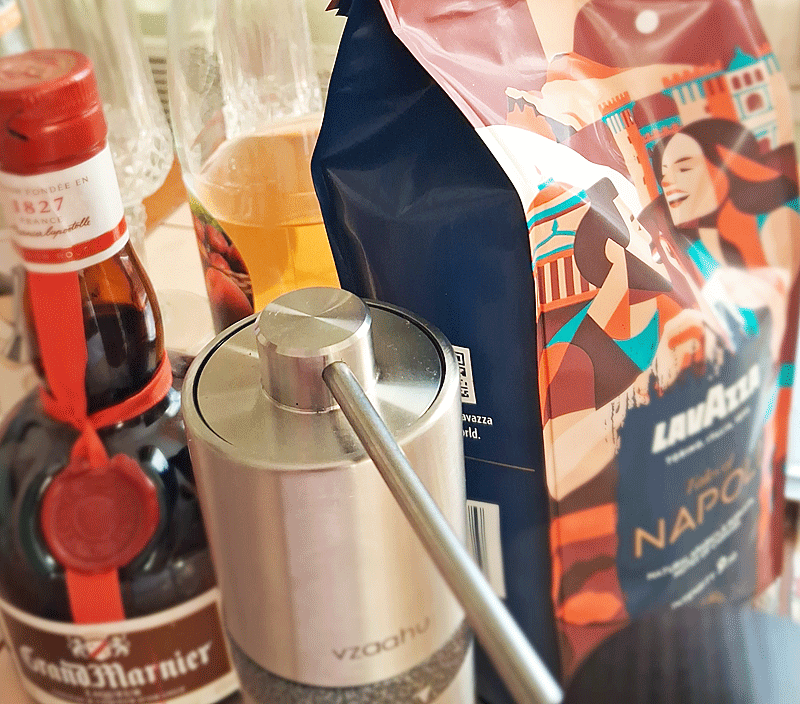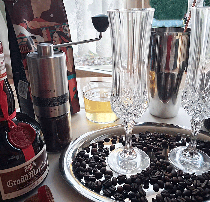 J’ai volontairement porté mon choix sur des grains à moudre, aux notes chocolatées, et ajouter 3 cl de jus de pomme clair – facultatif –par flûte à champagne. L’arôme d’un café aux notes chocolatées s’équilibre bien avec les notes d’orange de la liqueur. Quant à l’ajout du jus de pomme clarifié, c’est aussi l’accord de fête assorti, à la fois pour l’orange amère et l’exaltation d’un café. Bref, j’ai voulu faire l’expérience pour savoir comment la boisson terminée allait se marier avec cet ensemble des saveurs et obtenir une boisson légèrement alcoolisée.