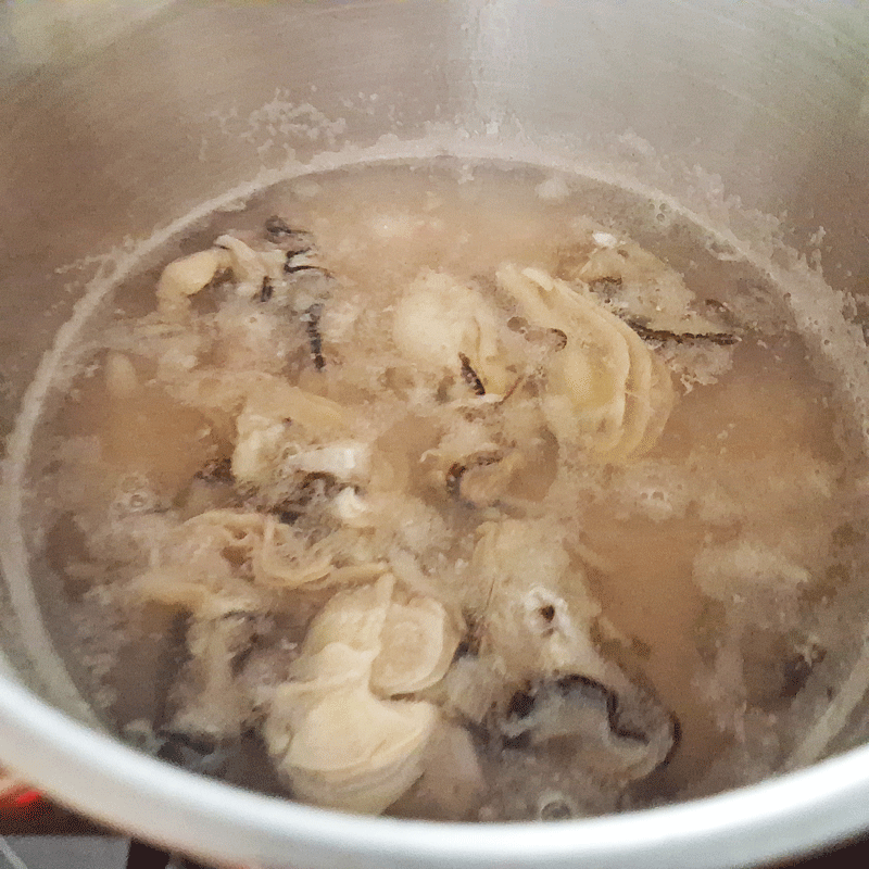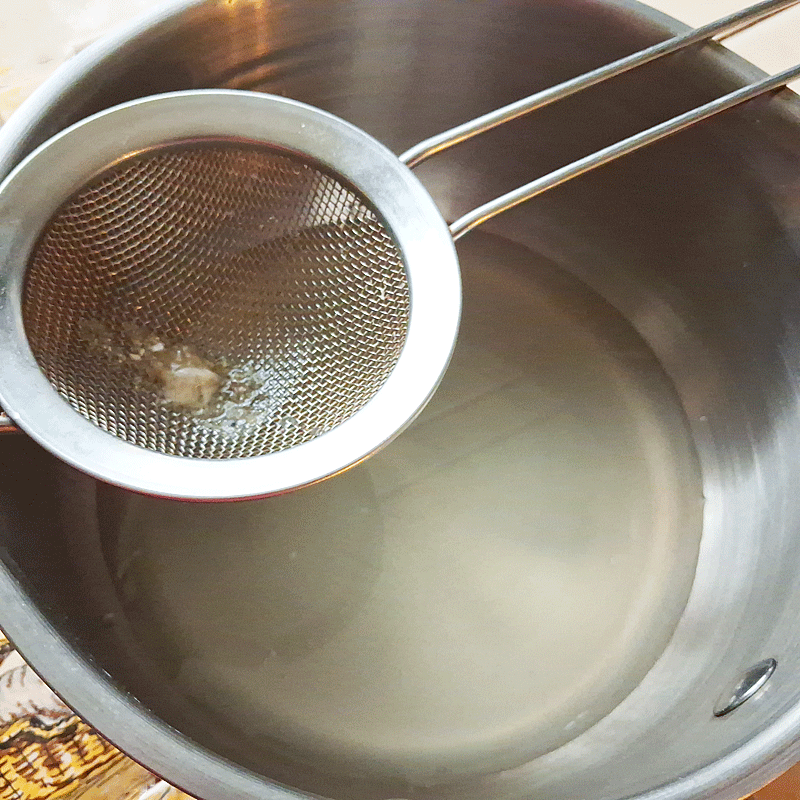 Dans la casserole d’eau des huîtres, versez 60 cl d’eau et le fumet : donnez 2 à 3 bouillons, puis retirez du feu et filtrez avec une passoire fine.