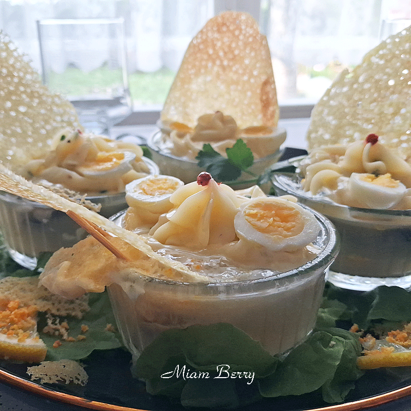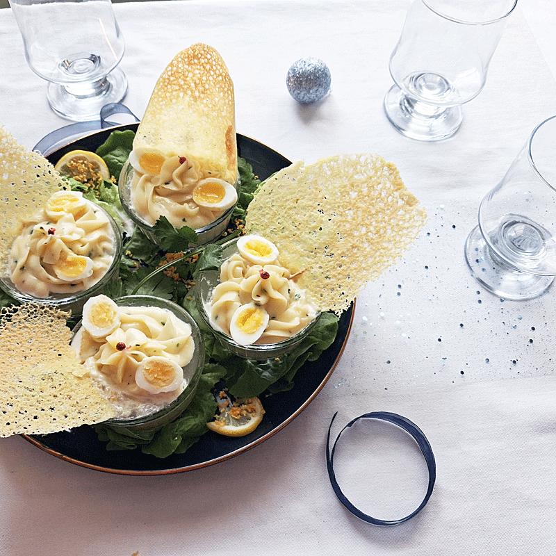 Une recette simple à réaliser, des huîtres en gelée servies d’œufs de caille, accompagnées d’une mayonnaise à la coriandre, estragon ou persil au choix.