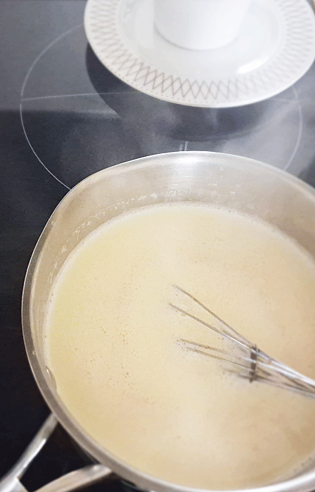 1. Dans une casserole, versez le lait et placez-le sur feu doux. Remuez avec amour jusqu’à ce qu’il commence à fumer, mais pas à bouillir ! Chers amis, pensez à un doux murmure plutôt qu’à un cri.