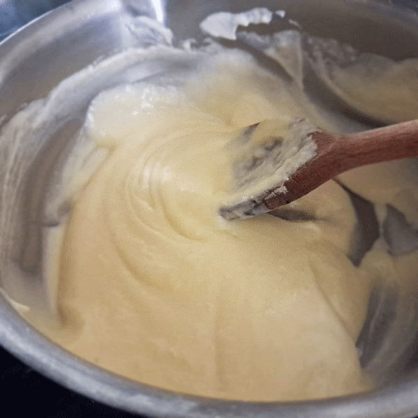 3. Porter à ébullition doucement, tout en tournant le mélange. Retirer du feu pour incorporer le fromage râpé, le roquefort aveyronnais émietté très finement, ainsi que les 2 jaunes d’œufs.