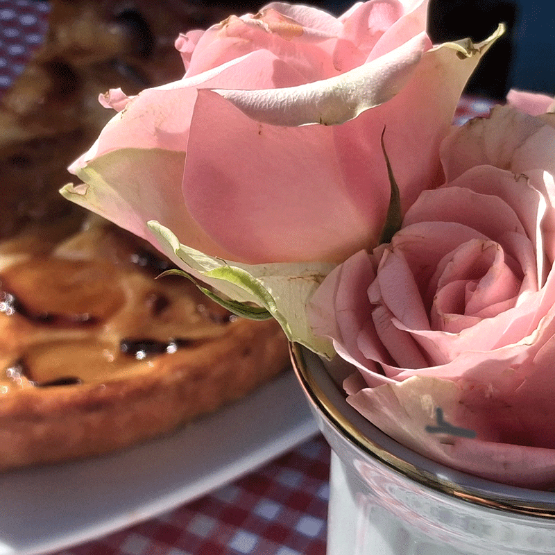C’est un dialogue silencieux entre la gourmandise et la délicatesse. La tarte, dorée raconte la cuisine simple, le sucre caramélisé, le partage d’un bon petit plat au jardin. Le bouquet de roses, lui, pour son parfum subtile qui élève l’instant.