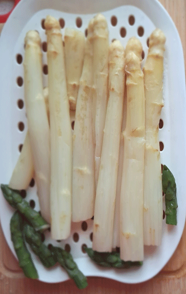 1. Éplucher soigneusement les asperges, les cuire à l’eau frémissante ou bien à la vapeur une dizaine de mn. Réserver.