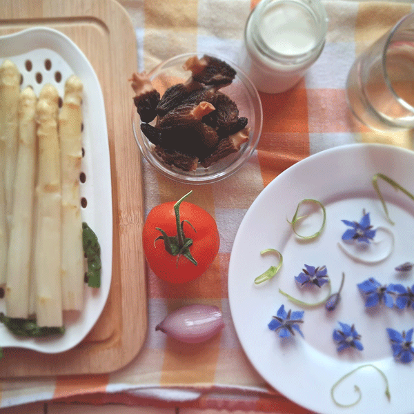 Je réitérais pour un troisième volet saisonnier, avec les asperges ramenées du marché. Cette fois, en préparant une assiette de printemps en mode asperges blanches, où la douceur des Landes dialogue avec la profondeur des morilles.