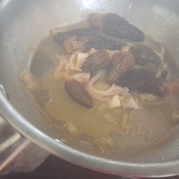 2. Nettoyer et réydrater les morilles, puis faire suer à feu doux avec l’échalotte ciselée et le beurre. Déglacer légèrement, ajouter la crème fraîche et réduire doucement.