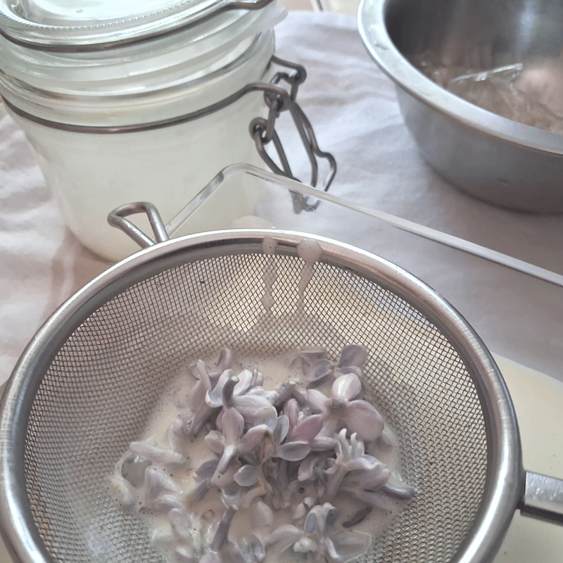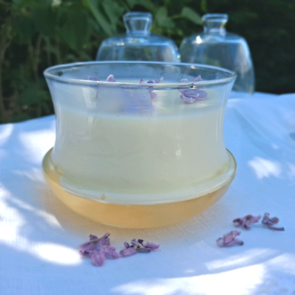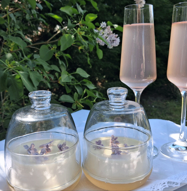 Une table discrète, nappée par reflets de lumière, à l’ombre d’un lilas en fleur. Comme on étend une nappe blanche pour cueillir le printemps, dessus, ajouter quelques sommités florales. Servir l’entremets parsemé de quelques fleurs de lilas fraîches non traitées, juste posées, car le parfum doit suggérer, pas envahir.