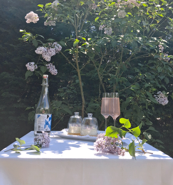 À côté, deux flûtes de limonade très fraîche, adoucie d’un sirop de lilas – prolongement liquide du jardin.