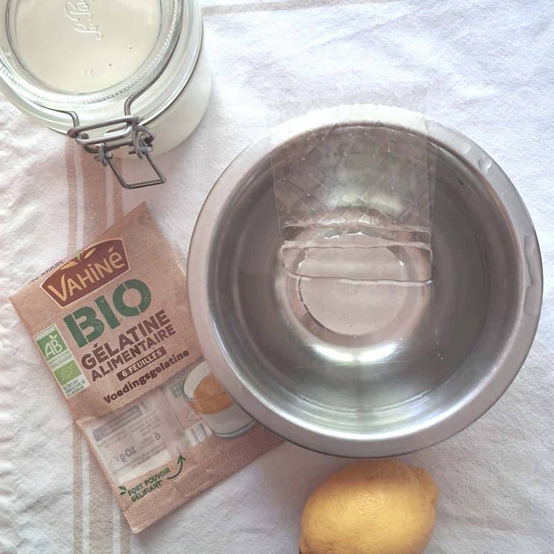 Plonger 2 feuilles de gélatine dans un bain d’eau froide : elles s’assouplissent comme des feuilles après la pluie.