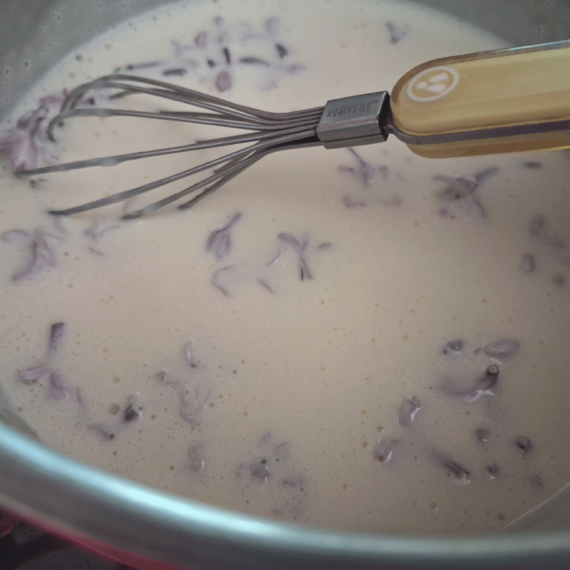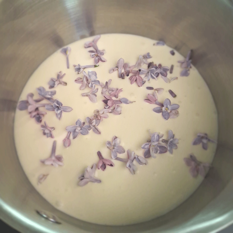 Dans une casserole, verser 30 clde crème liquide. Faire chauffer la crème jusqu’à frémissement – ne pas faire bouillir. Ajouter les fleurs, éteindre le feu et laisser infuser 20 à 30 mn à couvert.