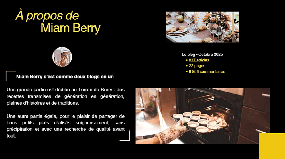 J’ai un parcours un peu atypique. Puis, en 2018, je créai un second blog – Miam Berry pour honorer nos traditions régionales tout en vivant de mes passions : écriture, photo, informatique ici aussi. J’ai passé d’innombrables heures, depuis, dans cette cuisine, à réaliser et à perfectionner les recettes que vous voyez s’afficher sur le blog aujourd’hui.